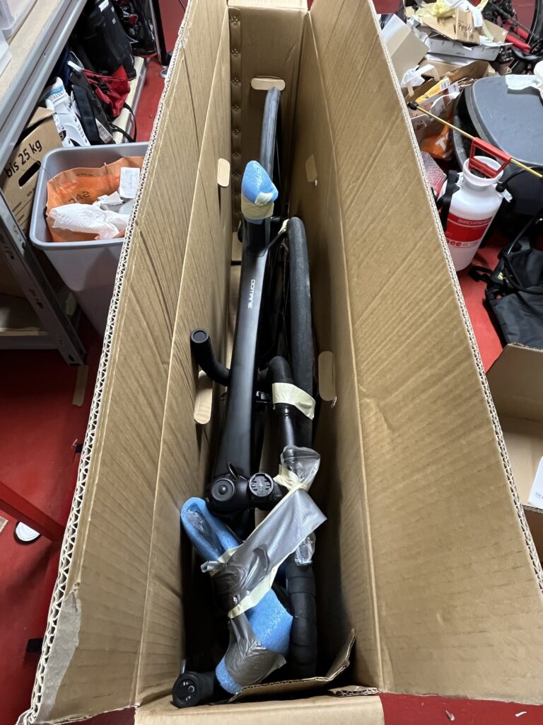 2024 - Nordkap-Fribourg Départ prévu le 1er août, les préparatifs vont bon train. Le vélo est paqueté dans un carton de 143x22x76. Cela passe au mm en démontant les pédales, la roue avant et la selle Alex El Soda Juli 21, 2024