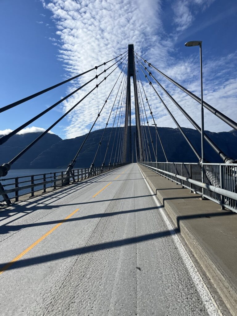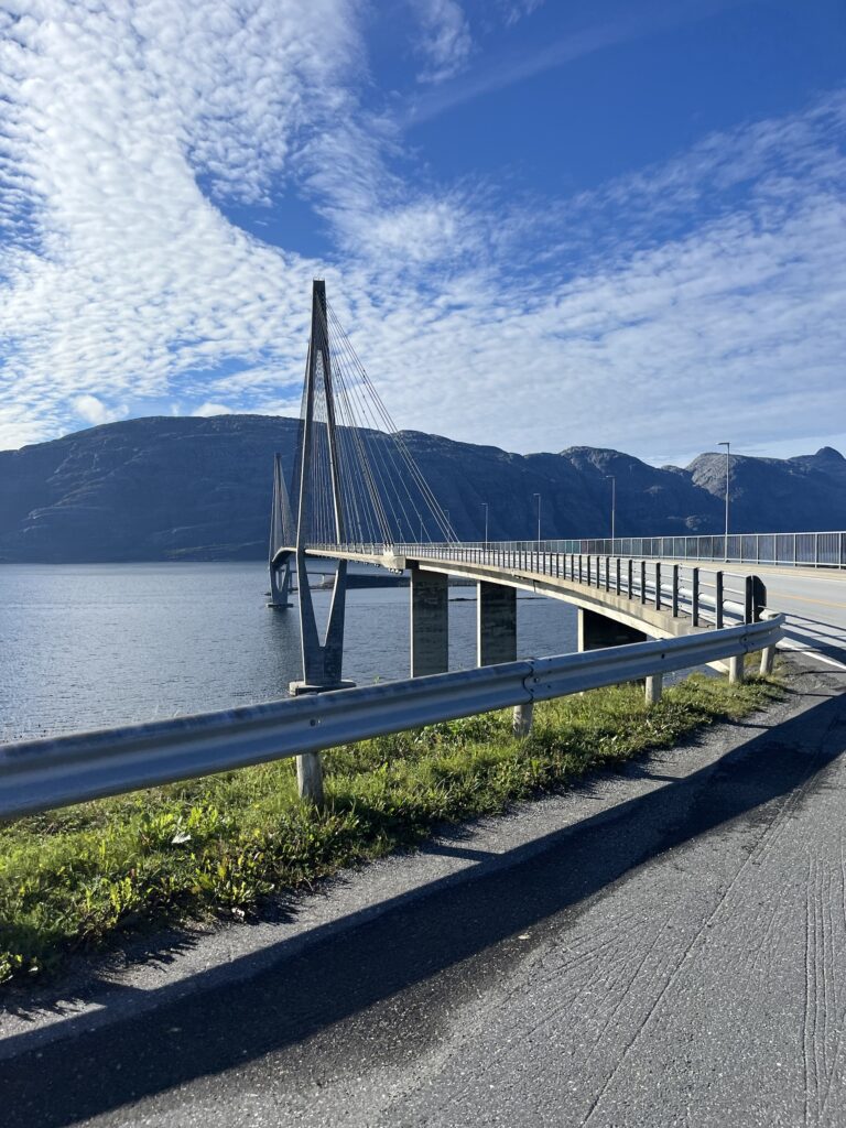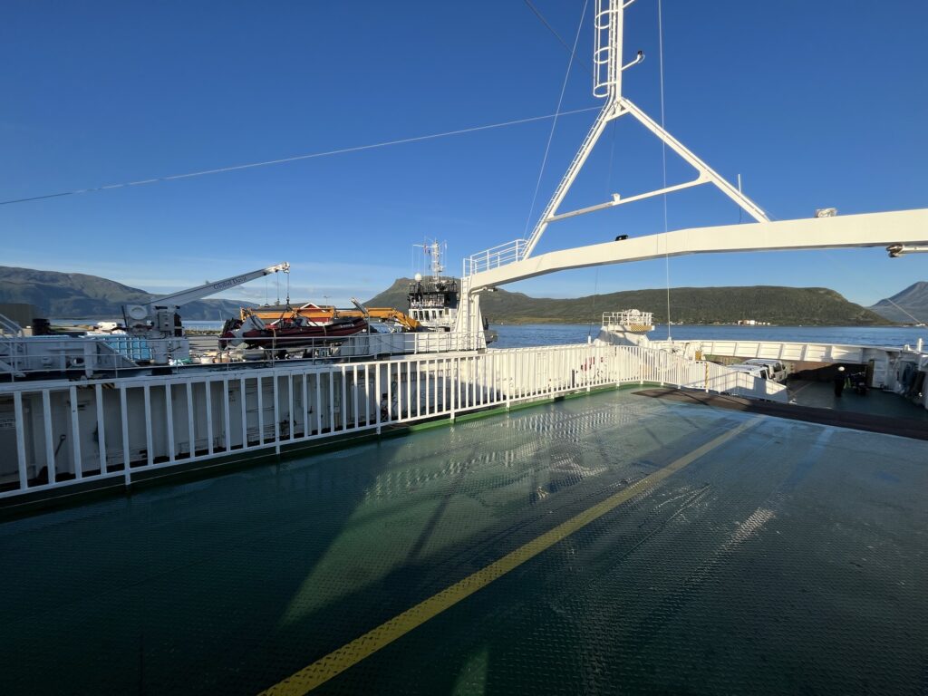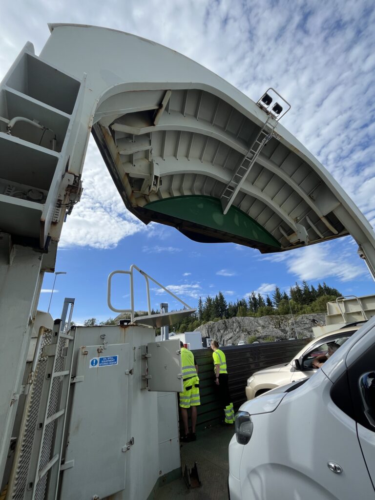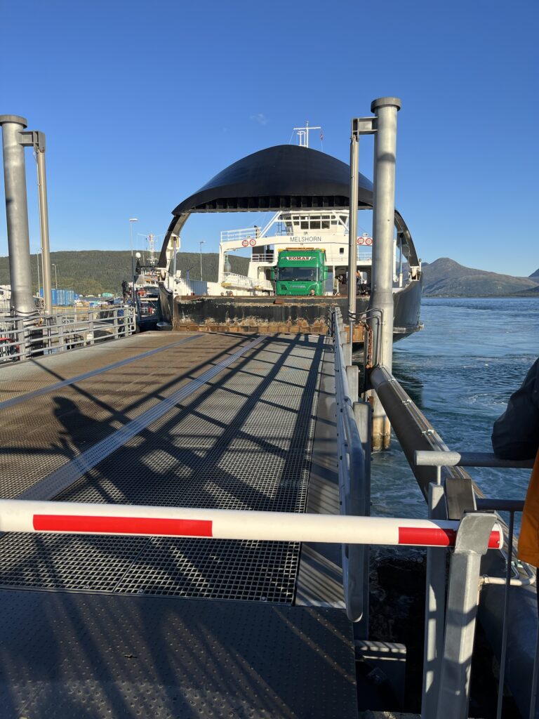 Ce qui m’amène à vous écrire sur le 2ème ennemi du cycliste: les ferrys 🙈. Le temps passé à planifier une journée avec 3 ferrys et un lieu pour dormir, c’est à peu près le même que le temps passé sur le vélo. Déjà, faut trouver l’horaire de chaque ferry et comprendre leur charabia, bien sûr c’est en norvégien. En plus trouver l’horaire actuel n’est pas chose facile, on trouve des horaires de 2021 sur des sites officiels. Et pour finir, il ne faut surtout pas se fier aux sites genre rome2rio, où on met la date et le lieu de départ et arrivée et l’horaire apparaît. Rien n’est correct. Donc quand on a compris tout cela, on peut commencer à planifier correctement. Nous on essaye de synchroniser le mieux possible les différents ferrys de la journée selon une équation compliquée. Mais le paramètre le plus important de l’équation, c’est l’heure de lever. Ben ouai, c’est quand même les vacances. Aujourd’hui, on a eu encore du bol car on savait qu’on devrait attendre un ferry pendant 1:30 et miracle, ils ont fait une traversée supplémentaire. Du coup on a attendu 10 minutes. Ça nous a permis de bronzer au soleil en arrivant au campement bien plus tôt que prévu 😎