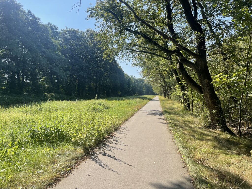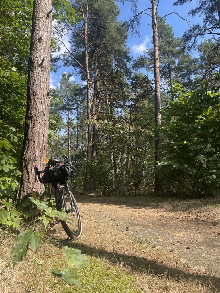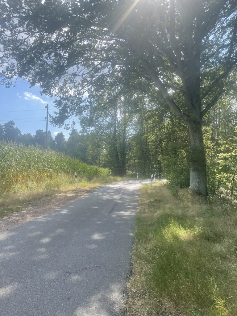 Wie alle anderen Tage mit Gegenwind, aber von Anfang an mit Sonnenschein und blauen Himmel. Die Route die mir Komoot zusammengestellt hat war tiptop, alles entweder Radwege oder verlassene kleine Nebenstrassen mit minimalem Verkehr. Immer wieder konnte ich schöne Wälder durchqueren die mir zum Teil riesig gross erschienen.