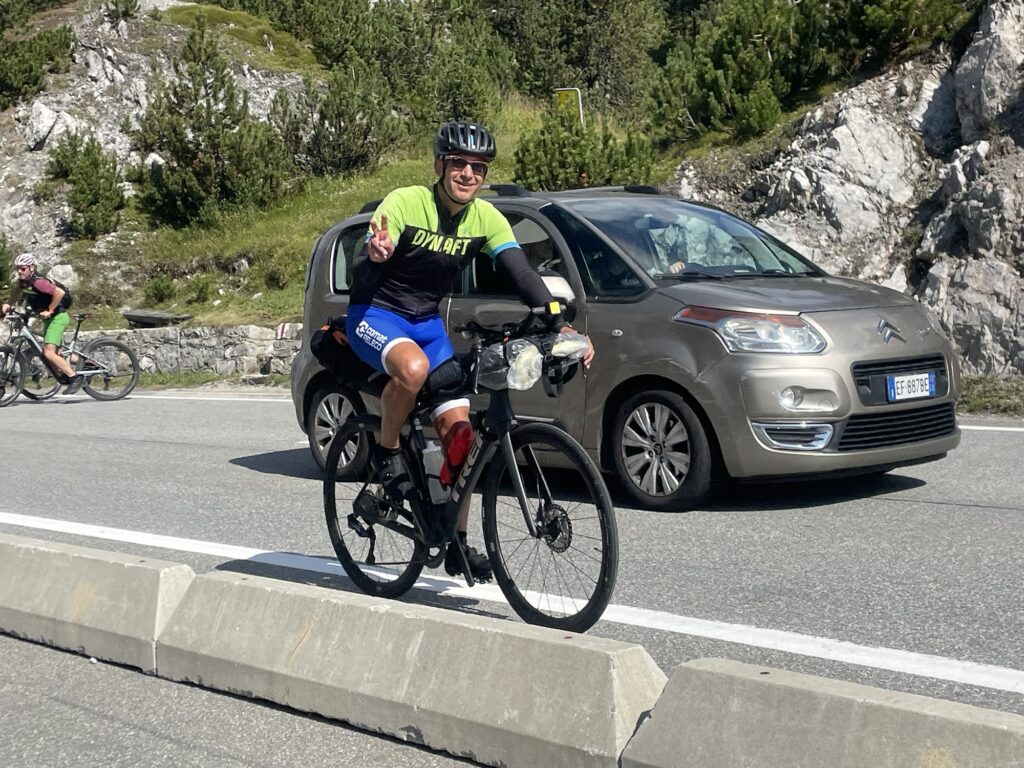 Aujourd’hui n’était pas une balade pour jeune fille enceinte! Je ne sais pas qui a dessiné le trajet mais une chose est sûre, c’est un masochiste grave: 3 cols dont 1 qui monte à 2’800m, ça le fait! La bonne nouvelle, c’était qu’après cela, il y a eu 80 km de descente avec 2’500m négatif, juste un gros kiffe. Pour finir encore 30km à plat avec un léger vent contraire, mais pas suffisant pour saper le moral!